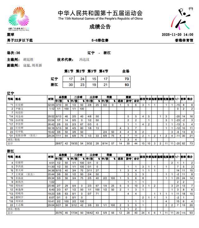 随着体能的消耗,到了第4节,仅7人出战的辽宁U22男篮就真的跟不上了,被浙江队把分差拉开到了20+。最终,辽宁U22男篮以73-93不敌浙江队,拿到了第6名。浙江队获得第5名。