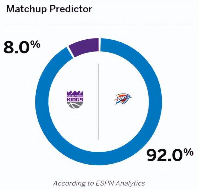 赛前,美媒ESPN对本场比赛进行了预测,雷霆胜率高达92.0%,国王胜率则仅有8.0%,差距非常离谱。首发阵容方面,雷霆队这边,排出的最新首发五人组为:谢伊-吉尔杰斯-亚历山大、多尔特、卡森-华莱士、切特-霍姆格伦和以赛亚-哈尔滕施泰因;国王队这边,首发阵容则为:威少、拉文、德罗赞、阿丘瓦、尤班克斯。
