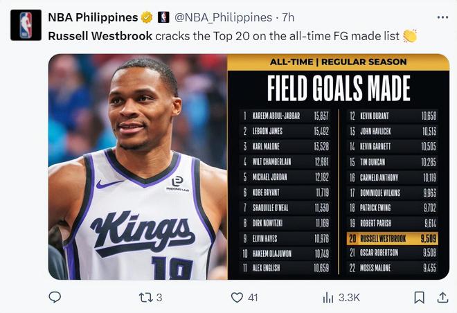 此役又是威少的里程碑之夜,他完成生涯9509个运动战进入联盟历史前20。