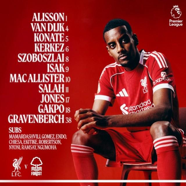 英超第12轮,利物浦主场迎战诺丁汉森林,赛前利物浦首发阵容已经出炉,具体名单如下: 利物浦首发:阿利松 / 柯蒂斯·琼斯、科纳特、范戴克、凯尔凯兹 / 索博斯洛伊、赫拉芬贝赫、麦卡利斯特 / 萨拉赫、伊萨克、哈克波