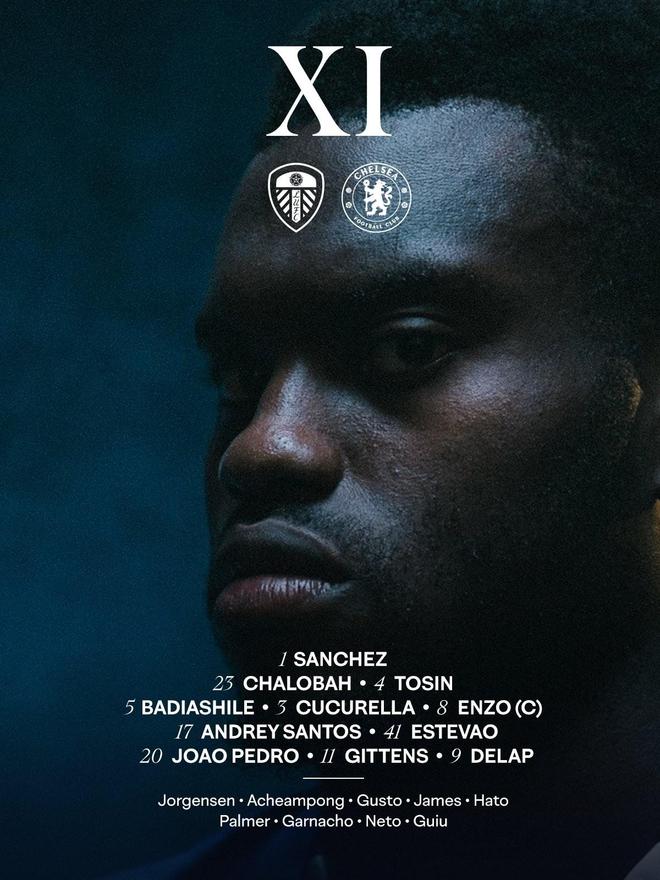 替补:7-佩德罗-内托、10-帕尔默、12-菲利普-约恩森、21-哈托、24-里斯-詹姆斯、27-古斯托、34-乔希-阿昌庞、38-吉乌、49-加纳乔